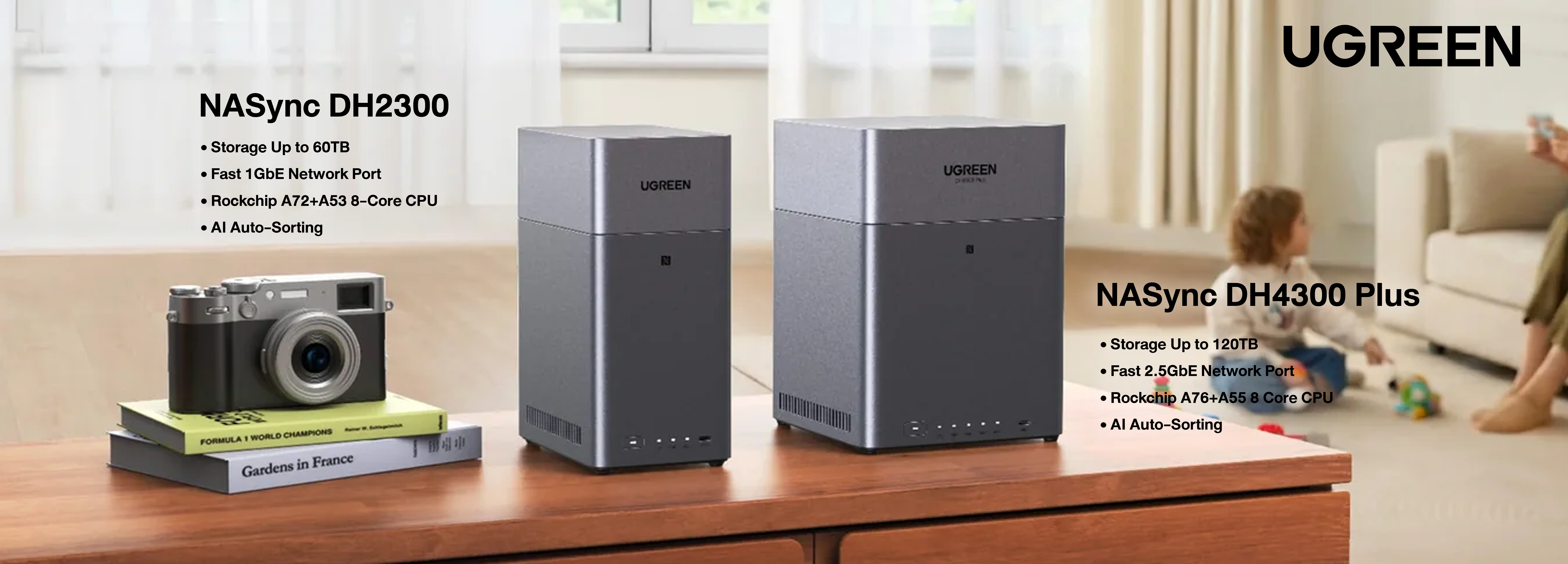 NAS 4 Bay, Rockchip A76+A55 8Core, 2.0Ghz , LPDDR4X 8GB - UGREEN NASync DH4300 Plus ศูนย์กลางคลาวด์ส่วนตัวขนาด 4-Bay ประสิทธิภาพสูงที่ออกแบบมาเพื่อครอบครัวยุคใหม่และโฮมออฟฟิศ จัดการสำรองข้อมูลรูปภาพและวิดีโอได้อัตโนมัติอย่างง่ายดาย มอบความลื่นไหลด้วยหน่วยประมวลผลประสิทธิภาพสูงและพอร์ตเชื่อมต่อที่ครบครัน รองรับการจัดเก็บข้อมูลปริมาณมากพร้อมความปลอดภัยระดับสูงในดีไซน์ที่เน้นความมินิมอลและทำงานเงียบสนิท