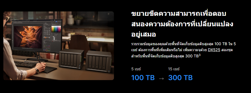 ขยายพื้นที่เก็บข้อมูล 5-bay ที่ออกแบบมาเพื่อเพิ่มความจุให้กับ Synology DiskStation ที่รองรับการเชื่อมต่อด้วยสาย USB Type-C ทำให้ขยาย Storage Pool หรือสร้าง Volume แยกได้ง่ายๆ แบบ Plug-and-Play. รองรับทั้ง HDD/SSD ขนาด 2.5 นิ้วและ 3.5 นิ้วแบบ Hot-swap ช่วยให้ขยายพื้นที่เก็บข้อมูลได้อย่างไม่สะดุด.