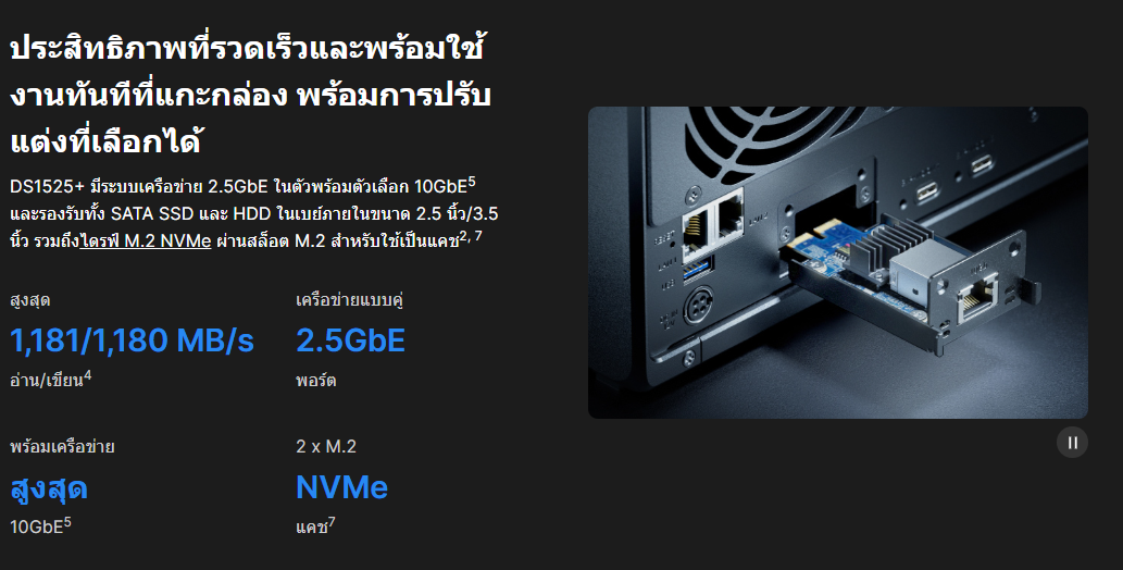 SSD cache | YES , 2 X Slot M.2 NVMe SSD 2280 *เพิ่ม SSD M.2 คลิก* |