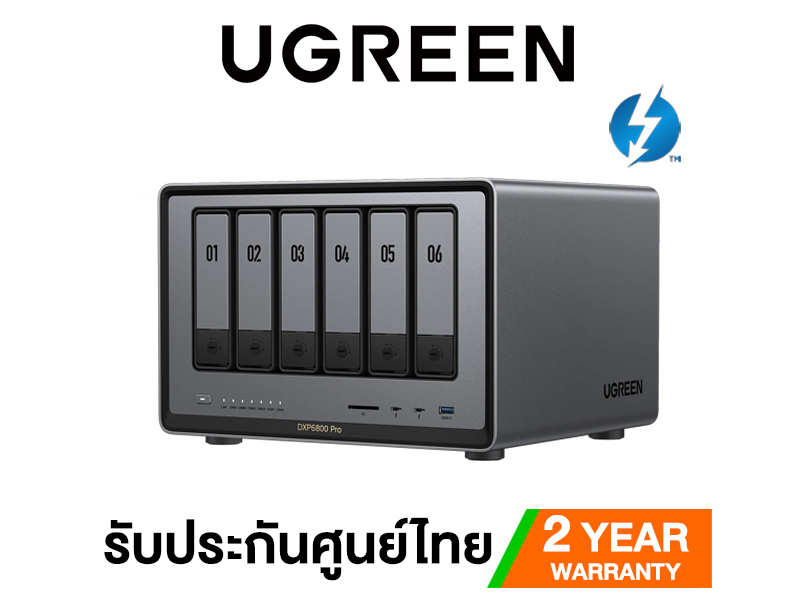 NAS 6 Bay, Intel i5 1235u 10Core 4.4Ghz , DDR5 8GB - UGREEN NASync DXP6800 Pro ทะยานสู่ระดับท็อปด้วยขุมพลัง Intel Core i5 (12th Gen) และพอร์ต 10GbE LAN แบบคู่ มอบประสิทธิภาพการประมวลผลขั้นสูงและการรับส่งข้อมูลที่เร็วแรงสะใจสำหรับสตูดิโอและองค์กร รองรับดิสก์สูงสุด 6-Bay พร้อมสล็อต Dual M.2 NVMe และพอร์ต Thunderbolt 4 ถึง 2 พอร์ต ช่วยให้การตัดต่อวิดีโอความละเอียดสูงและการจัดการเวิร์กโหลดหนักๆ กลายเป็นเรื่องง่ายและสมบูรณ์แบบ