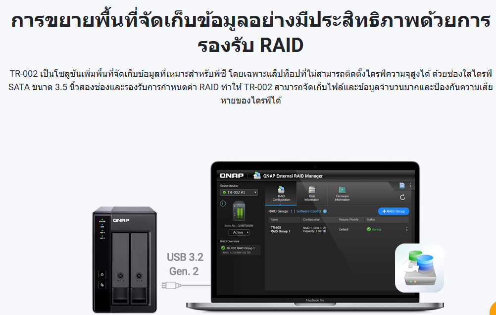Expansion อุปกรณ์ขยายความจุ ของ NAS QNAP และ PC - TR-004 เป็นโซลูชันการขยายพื้นที่จัดเก็บข้อมูลในอุดมคติสำหรับพีซี โดยเฉพาะอย่างยิ่งสำหรับแล็ปท็อปที่ไม่มีความสามารถในการติดตั้งไดรฟ์ที่ใหญ่กว่าและมีความจุสูงกว่า ด้วยช่องใส่ไดรฟ์ SATA ขนาด 3.5 นิ้วจำนวน 4 ช่องและรองรับการกำหนดค่า RAID ทำให้ TR-004 มอบความสามารถในการจัดเก็บไฟล์และข้อมูลจำนวนมาก และเพื่อให้มั่นใจถึงการป้องกันความล้มเหลวของไดรฟ์ที่อาจเกิดขึ้น